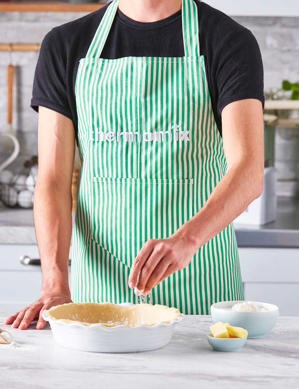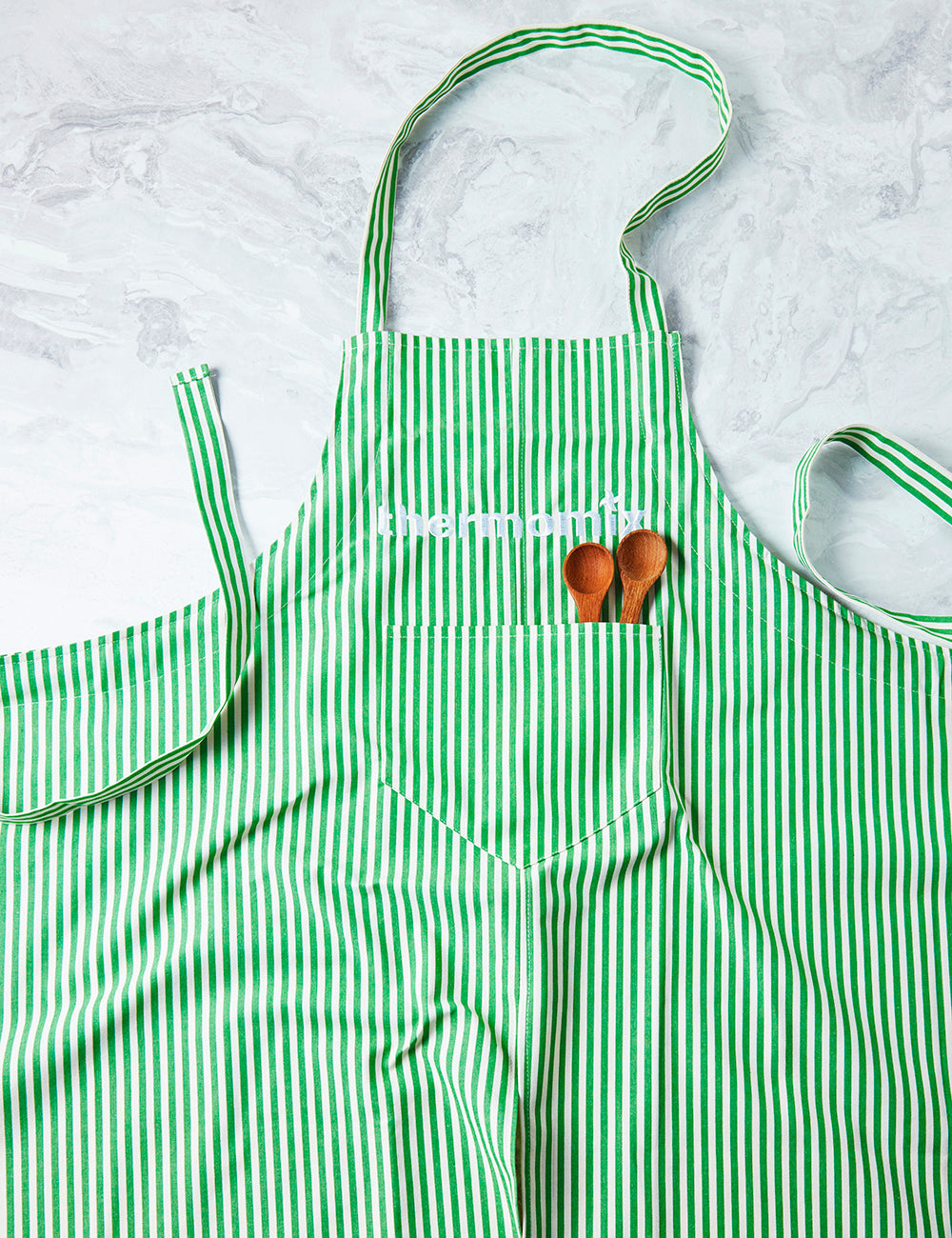 This Thermomix® apron is the perfect kitchen garment for cooking enthusiasts. With a classic white and green striped finish, plus an embroidered logo at the front, this apron ensures your cooking is both comfortable and stylish.